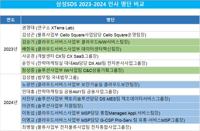이밖에도 상무로 승진한 인물도 생성형 AI, 클라우드 등의 분야에서 성과를 낸 리더들이 주를 이뤘다. 승진자는 김성범 상무(법무팀 국내법무그룹), 노광빈 상무(클라우드서비스사업부 보안기술실 클라우드보안팀장), 민대홍 상무(전략마케팅실 금융AM1팀 금융사업그룹장), 서진우 상무(솔루션사업부 팩토리솔루션담당 DS MES팀 제조데이터서비스그룹장), 이관희 상무(솔루션사업부 지원팀장), 이동섭 상무(클라우드서비스사업부 MSP담당 통합Managed Appl.서비스팀장), 이명교 상무(클라우드서비스사업부 MSP담당 G-CSP Pro-Serv.팀 유통·서비스MSP그룹장), 최병철 상무(물류사업부 전자물류사업팀 전자통합사업그룹장)으로 8명이었는데 이 중 5명이 클라우드 분야 담당자였다.