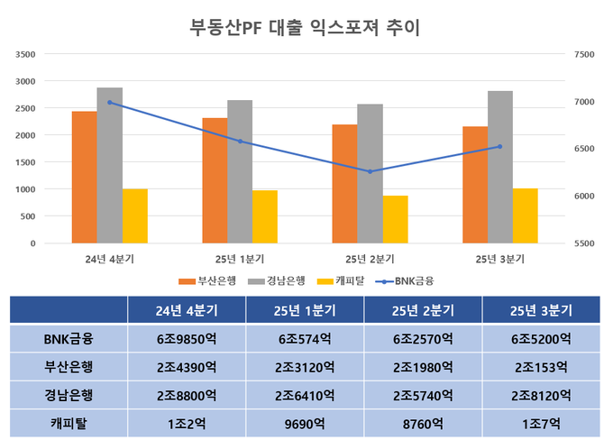 BNK금융이 발표한 3분기 경영실적에 따르면 부동산PF 대출 익스포저는 6조5200억원을 기록했다. 지난해 말(6조9850억원) 이후 올해 2분기까지 감소세를 이어가다가 3분기 들어 소폭 반등했다.