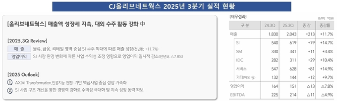 비상장사인 CJ올리브네트웍스의 실적은 모기업 CJ CGV가 매 분기마다 발표하는 IR자료에서 확인할 수 있다. 이에 따르면 올해 3분기 CJ올리브네트웍스의 매출은 전년 동기 대비 11.7% 증가한 2043억원을 기록했다.