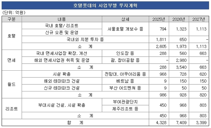 국내에서는 면세사업장 확장과 개선, 해외에서는 면세사업권 취득 및 운영에 투입된다. 호텔롯데는 2027년까지 집행 예정인 1조5137억원은 추진 중인 자산 매각을 통해 확보한 자금, 대여금, 보증금과 영업활동으로 유입된 현금으로 마련할 계획이다.