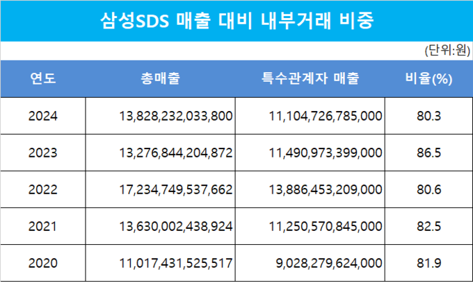 이 같은 노력으로 클라우드 부문을 중심으로 IT 매출은 꾸준히 성장했지만 내부거래 비중은 여전히 높다. 사업보고서에 따르면 2020년부터 2025년 반기까지 삼성SDS의 특수관계자 매출 비중은 평균 82% 수준이다. 2023년 86.5%까지 상승했다가 2024년 80.3%로 낮아졌지만 올해 상반기 기준 다시 81.3%로 올랐다.