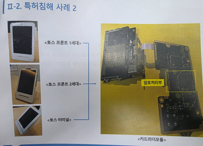 이와 함께 신용카드 정보 암호화 관련 기술 역시 특허를 침해한 것으로 보고 있다. 토스 프론트 1·2세대와 토스 터미널 제품을 분해한 결과 카드리더 모듈 내부의 암호처리부 구조가 자사 특허 기술과 유사한 형태로 구성돼 있었다고 설명했다.