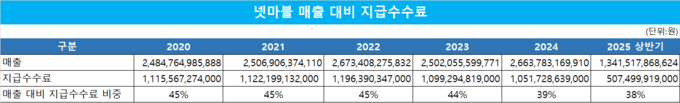 2021년 지급수수료 비중은 영업비용 대비 약 48%였으며 이후 2022년 43%로 떨어진 뒤 2024년까지 비슷한 수준을 유지했다. 매출 대비 지급수수료율은 2020년 45%에서 2024년 39%, 2025년 상반기 기준 38%로 하락세를 이어가고 있다.