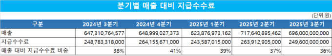 이를 적용할 경우 3분기 지급수수료는 약 2496억원으로 매출 대비 지급수수료율은 약 36% 수준이다. 어느 쪽을 기준으로 보더라도 지급수수료율은 완만한 하락세를 이어가고 있다.