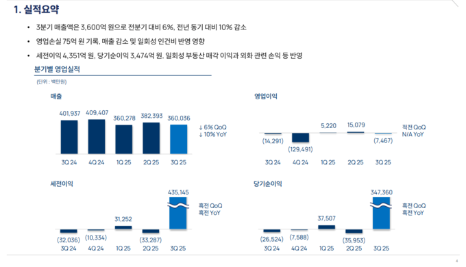 [FETV=신동현 기자] 엔씨소프트는 실적 발표를 통해 2025년 3분기에 매출 3600억원, 영업손실 75억원, 당기순이익 3474억원을 기록했다고 11일 밝혔다. 매출은 전분기 대비 6%, 전년 동기 대비 10% 감소했다. 영업이익은 퇴직 위로금 등 일회성 비용의 영향으로 적자를 기록했다. 당기순이익은 엔씨타워1 매각 대금이 반영되며 흑자 전환했다.