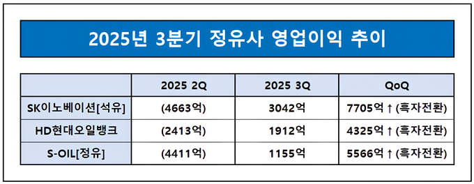 올해 3분기 정유사들은 일제히 흑자전환에 성공했다. SK이노베이션은 석유사업 매출 12조4421억원, 영업이익 3042억원을 기록해 전분기 영업손실 4663억원에서 흑자로 돌아섰다. S-OIL 역시 정유부문 영업이익 1155억원으로 전분기 영업손실 4411억원에서 반등했다. HD현대오일뱅크도 영업이익 1912억원으로 전분기 영업손실 2413억원 대비 만회한 실적을 보였다.