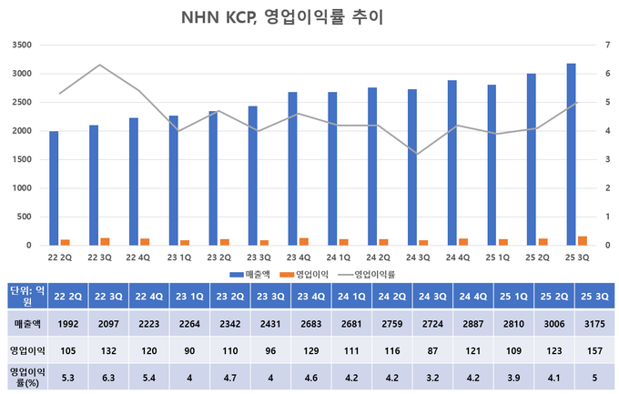 NHN KCP는 올해 3분기 매출 3175억원, 영업이익은 157억원을 기록했다. 전년 동기 대비 각각 17%, 79% 증가한 수치다. 영업이익률도 5%를 기록, 2022년 4분기 이후 처음으로 5%대를 회복했다.