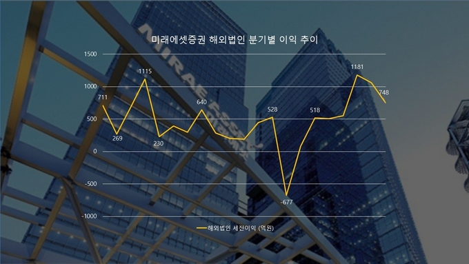 12일 금융권에 따르면 미래에셋증권의 올해 3분기 해외법인 세전이익은 748억원으로 집계됐다. 직전 분기(1061억원) 보다는 10.1% 감소했지만 지난해 3분기(508억원)와 비교하면 47.2% 증가한 수준이다.
