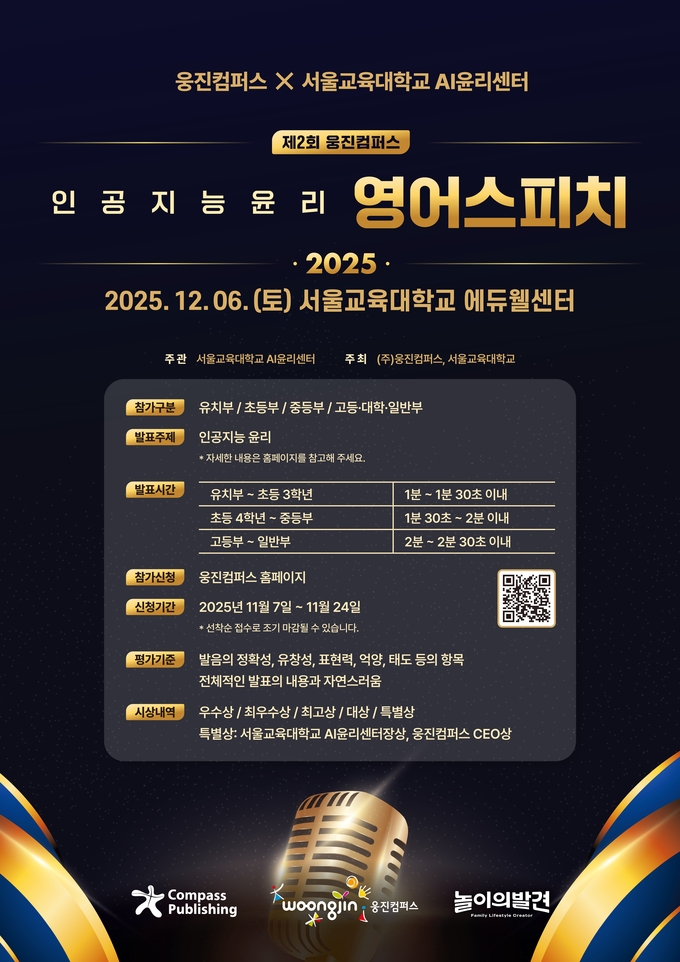 [FETV=나연지 기자] 글로벌 영어교육 전문기업 웅진컴퍼스가 오는 12월 6일 서울교육대학교 에듀웰센터에서 '제2회 웅진컴퍼스 인공지능 윤리 영어스피치 2025'를 개최한다고 18일 밝혔다.
