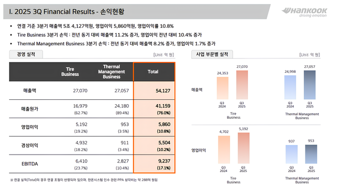 [FETV=이신형 기자] 한국타이어앤테크놀로지가 3분기 시장 컨센서스를 크게 상회하는 어닝 서프라이즈를 기록하며 한국앤컴퍼니그룹의 실적 견인을 이끌었다. 업계는 이상훈·안종선·박정수 3축 분할 경영 체제에 주목하고 있다.