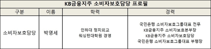 KB금융의 경우 박영세 부행장이 KB금융지주 소비자보호담당과 국민은행 소비자보호그룹대표를 겸직하고 있다. KB금융지주 소비자보호담당의 임기는 올해 말까지다. 박 부행장은 2023년 국민은행 소비자보호그룹대표 전무, 2024년 KB금융지주 소비자보호본부장을 지냈다.