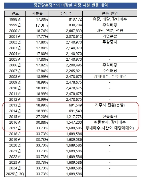 이장한 회장은 유상증자, 주식배당, 장내매수를 통해 주식을 취득하면서 종근당홀딩스의 지분율을 점진적으로 상승시켜 나갔다. 그러다 2013년 지주사 전환 이후 지분율이 급격하게 상승했다. 종근당홀딩스가 2015년과 2016년에 유상증자를 진행했고 이에 종근당과 종근바이오 주주가 현물출자로 참여했다.