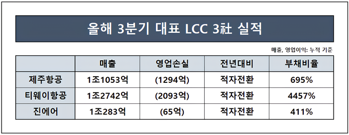 티웨이항공은 올해 3분기 누적 기준 매출 1조2742억원 영업손실 2093억원을 기록해 적자가 크게 확대됐고 진에어 역시 매출 1조283억원 영업손실 65억원으로 전년 1400억원대 흑자에서 적자로 돌아섰다. 3개사 누적 영업손실만 약 3400억원대 규모다.