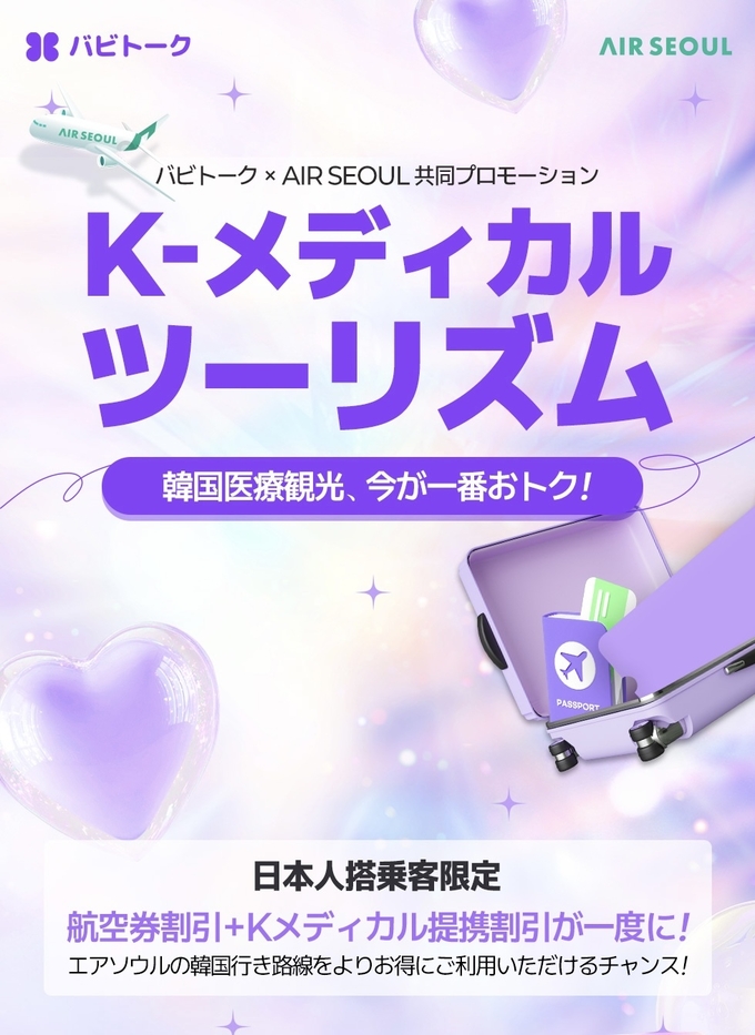 [FETV=이신형 기자] 에어서울이 글로벌 미용 의료 서비스 정보 플랫폼 ‘바비톡’과 협업해 일본인 관광객을 위한 ‘K-메디컬 의료관광 프로모션’을 진행한다고 24일 밝혔다.