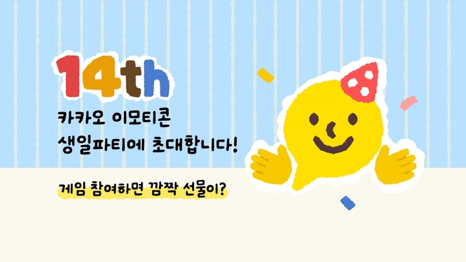 카카오는 14주년을 맞아 기념 이벤트 페이지를 열고 참여형 콘텐츠를 제공한다. 올해 인기 캐릭터 ‘망그러진 곰’, ‘가나디’, ‘GO라니’, ‘토심이’, ‘극락 쿼카’ 등 14종의 작가들이 축전 이미지를 공개하고, 이용자가 직접 참여하는 ‘생일 케이크 굽기 게임’도 운영한다. 게임 참여자 중 1만 명에게는 ‘이모티콘 플러스’ 1개월 이용권이 제공된다.