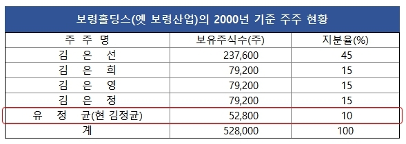 같은 기간 보령산업의 주주로 오너 3세 장남 김정균(옛 유정균) 사장도 명단에 포함돼 있었다는 점이 눈에 띈다. 1985년생인 김정균 사장의 나이 15세일 때다. 보령산업의 주주 현황이 공개된 시점을 기준으로 했다는 점을 고려하면 그 이전에 지분부터 지분을 보유했던 셈이다.