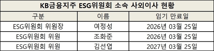 소위원회 중 ESG위원회는 위원장을 맡고 있는 여정성 사외이사를 포함해 조화준·김선엽 사외이사가 배정돼 있다. 사외이사를 제외하면 양종희 회장과 이환주 KB국민은행장이 위원으로 들어가 있다.