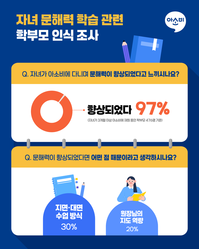 [FETV=장명희 기자] 유치~초2 전문 교육 브랜드 아소비가 재원생 학부모 766명을 대상으로 자녀의 문해력 학습에 대한 인식 조사를 실시한 결과, 응답자의 99%가 문해력 향상이 필요하다고 인식하고 있는 것으로 나타났다고 28일 밝혔다.
