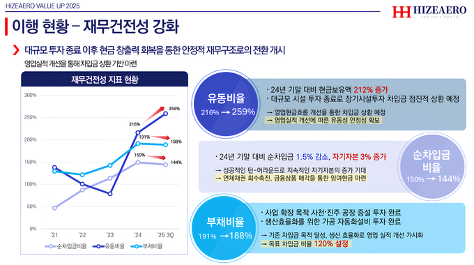 수익성 회복도 구체적인 개선 흐름을 보였다. 올해 3분기 원가율은 전년 대비 약 12% 개선된 83%를 기록했다. 이는 자체 생산 비중 확대와 인력 효율화, 자동화 설비 도입 등이 복합적으로 반영된 것으로 보인다. 이를 기반으로 하이즈항공은 지난 기업가치 제고 계획에서 목표했던 영업이익률 7%대를 달성해 지난해 영업이익률 -6%에서 반전에 성공했다.
