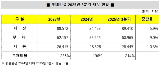 실제 롯데건설의 재무 부담이 커진 것은 사실이다. 프로젝트파이낸싱(PF) 부실 여파로 2023년말 235%였던 부채비율이 지난해 말 196%까지 떨어졌다가 올 3분기 214%로 다시 상승했다. 또한 장기차입금 증가에 따른 금융비용 증가로 3분기 순익도 전년 대비 급감해 29억원에 그쳤다.