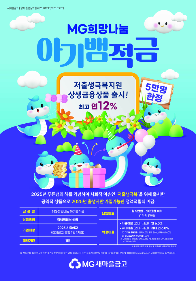 [FETV=임종현 기자] 새마을금고는 저출생 극복 지원을 위해 지난 4월 출시한 사회공헌 금융상품인 ‘MG희망나눔 아기뱀적금(이하 아기뱀적금)’이 약 4만7000 계좌가 판매됐다고 밝혔다. 아기뱀적금은 5만 계좌를 한도로 출시된 1년 만기 정기적금 상품이다. 내년 1월까지 가입할 수 있으나 판매한도 소진 시 조기 종료된다.