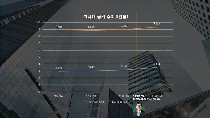 실제로 AA- 등급 회사채의 3년물 금리는 11월12일 3.331%에서 이달 4일 3.492%로 상승하며 연중 최고치(3.484%)를 웃돌았다. 올해 최저치(2.846%)와 비교하면 약 64bp(bp=0.01%p)나 오른 수준이다.