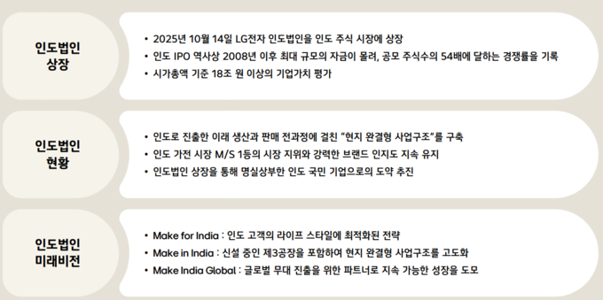 이 구조 변화가 시장에서 검증된 사례로 꼽히는 것이 인도법인 IPO다. 인도 IPO는 시가총액 18조원, 경쟁률 54배로 흥행하며 LG전자가 추진하는 현지 완결형 모델의 경쟁력을 입증했다는 평가다. 인도 법인은 기획–생산–판매가 모두 현지에서 돌아가는 구조로, 글로벌 전환 전략의 실험장으로 자리하고 있다.