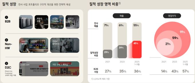 LG전자는 지난해 ▲B2B 매출 비중 확대 ▲webOS·구독·직판 등 서비스 기반 강화 ▲투자 효율성 제고 ▲현지 완결형 비즈니스 모델 확장 ▲주주환원 구조 명확화 등을 밸류업 핵심 과제로 제시했다. 올해 이행 현황을 보면 영업이익률은 4%대에 정체돼 있지만, 영업이익의 90% 이상이 B2B·소프트웨어·서비스에서 발생하는 구조로 빠르게 이동했다. 이는 제조 중심 사이클에서 반복 매출·서비스 중심 모델로 바뀌면서 LG전자의 ‘수익 원천’이 달라지고 있음을 보여준다.