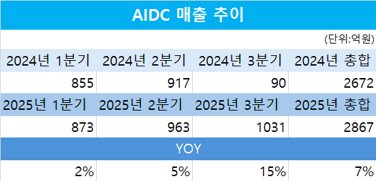 핵심 성장축으로 제시된 AIDC 사업은 목표 대비 양호한 실적을 냈다. 2025년 3분기 AIDC 매출은 1031억원으로 전년 대비 약 15% 증가했다. 1~3분기 누적 성장률은 평균 7%로 연간 성장 목표(7~9%)에 부합한다. 분기별 성장률도 2%, 5%,15%로 증가하는 추세다.