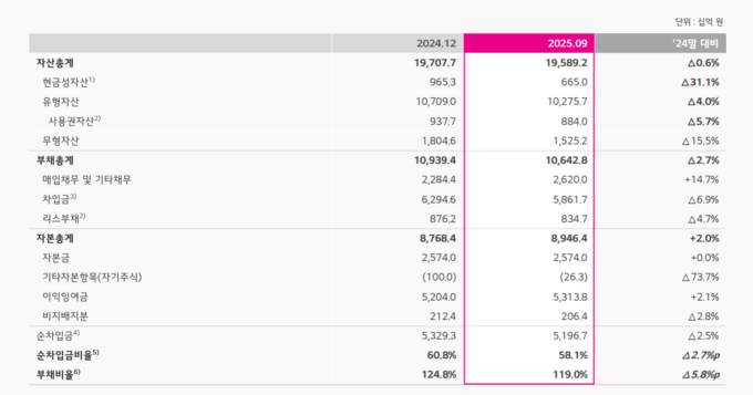 재무건전성 역시 개선세를 보이고 있다. 부채총계는 전년 말 대비 2.7% 감소한 10조6428억원, 자본총계는 2% 증가한 8조9464억원으로 집계되며 부채비율은 124.8%에서 119%로 5.8%p 하락했다. 차입금과 리스부채가 각각 6.9%, 4.7% 감소한 것이 영향을 미쳤다. 다만 목표치인 100%와는 여전히 격차가 있어 현 개선 속도를 감안하면 도달까지는 시간이 더 필요할 전망이다.