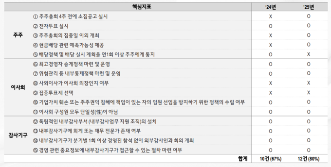 지배구조 핵심지표 준수율은 지난해 67%에서 올해 80%로 높아졌다. 주총 30일 전 소집공고, 집중일 회피, 배당 예측 가능성 제공 등이 반영된 결과로, 예측 가능성과 투명성이 강화되며 지배구조 디스카운트 완화 요인으로 평가된다.