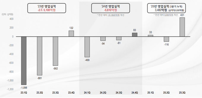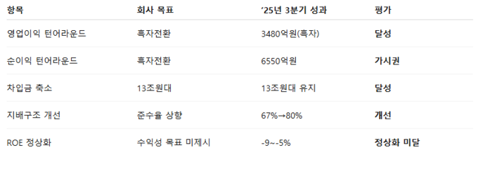 제시된 중기 목표는 상당 부분 이행됐다. 영업이익은 누적 3480억원으로 흑자전환 목표를 조기 달성했고, 순이익도 6550억원으로 연간 턴어라운드가 가시권에 있다. 차입금은 목표치인 13조원대를 이미 충족했으며, 지배구조 핵심지표 준수율 역시 67%에서 80%로 개선됐다. 다만 수익성 지표는 여전히 전환기 국면에 있어 추가 개선이 필요한 상황이다.