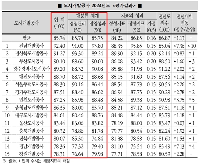 2024년도 지방공기업 평가에서 15개 도시개발공사 전체의 평균평점은 지난해보다 낮아졌다. 경영관리 측면에서 조직·인사관리 평점은 상승한 데 비해 전략 및 혁신 평점은 하락했다. 경영성과 측면에서는 지역개발사업 추진 등은 성과를 보였으나 영업수지가 하락하고 자본·노동생산성이 3개년 평균 대비 악화된 것으로 나타났다.