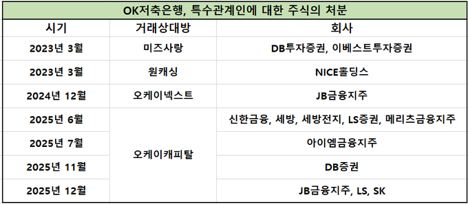 [FETV=임종현 기자] OK저축은행은 보유 주식 매각 시 시장 대신 관계사인 OK캐피탈을 활용하고 있다. 주가 상승으로 자본 규제가 적용되기 전에 블록딜(시간외 대량매매) 방식으로 넘기는 구조다. 2023년 오케이네트웍스(전 원캐싱), 2024년 오케이넥스트 등 관계사에 지분을 넘겼지만 올해부터는 OK캐피탈로 일원화됐다.