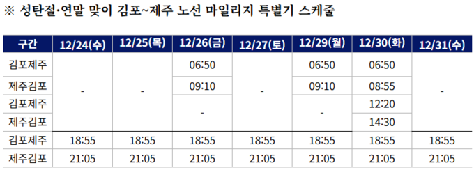 대한항공은 보다 편리한 스케줄로 특별기를 운영해 성탄절과 연말 맞이 여행을 계획하는 고객들에게 마일리지 편의성을 높이고 쾌적한 항공 여행을 선사한다는 계획이다. 이번 마일리지 특별기는 크리스마스이브인 12월 24일부터 김포~제주 노선 특정 시간대에 마일리지로 우선 발권이 가능하도록 마련됐다. 단 28일은 운항하지 않는다.