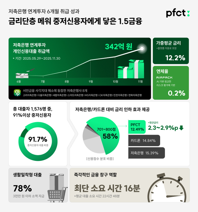 PFCT는 지난 5월29일부터 11월 말까지 8곳의 저축은행 투자금을 조달해 총 1576명에게 342억원의 개인신용대출을 공급했다. 취급된 대출의 가중평균금리(플랫폼이용료포함)는 12.2%, 연체율은 0.2%, 연체 건수로는 단 3건으로 2금융권 평균 대비 크게 낮다.