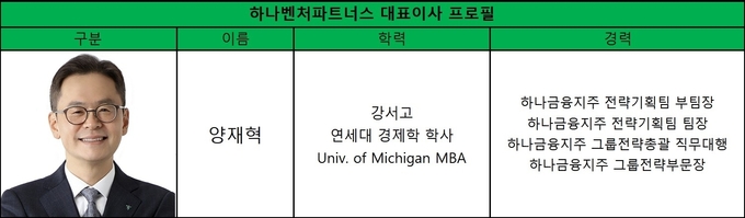 조직을 이끄는 수장은 양재혁 대표다. 그는 지난해 말 실시된 그룹의 관계회사 대표이사 후보 추천에서 하나벤처스 대표이사 사장으로 발탁됐다. 양 대표는 연세대에서 경제학, 미국 미시간대에서는 MBA를 취득했다. 하나벤처스 대표로 이동하기 전 양 대표는 하나금융지주에서 전략기획팀 부팀장·팀장, 그룹전략총괄 직무대행, 그룹전략부문장 등을 역임했다.