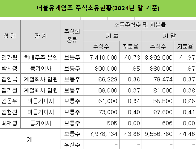 더블유게임즈는 김가람 대표에게 의사결정 권한이 집중된 지배구조를 갖고 있다. 김 대표는 설립자이자 대표이사, 이사회 의장을 겸직하고 있으며 2024년 기준 보통주 889만2000주(약 41%)를 보유한 최대주주다. 특수관계인 지분을 포함하면 ‘김가람 외 6인’ 체계로 44%대 중반을 보유해 사실상 주주총회와 이사회 결정에 절대적 영향력을 행사할 수 있는 구조다.