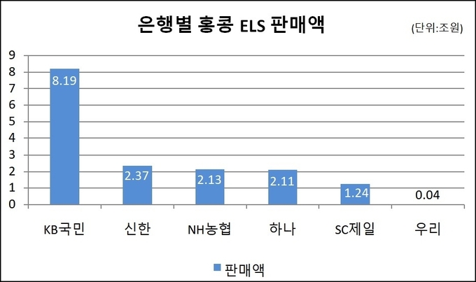 은행별 홍콩 ELS 판매 금액은 KB국민은행이 8조1972억원으로 은행권 중 가장 큰 규모다. KB국민은행이 주요 5대 은행(KB국민·신한·하나·우리·NH농협)의 ELS 판매 금액에서 차지하는 비중은 약 55% 수준이다. 나머지 사전 통보 명단에 포함된 은행의 판매 금액은 규모 순으로 신한은행 2조3701억원, NH농협은행 2조1310억원, 하나은행 2조1183억원, SC제일은행 1조2427억원 등이다.