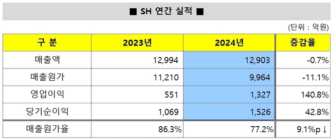 2024년 SH의 전체 매출은 전년 대비 큰 변화가 없었다. 그러나 매출원가는 11% 감소하면서 매출원가율을 86.3%에서 77.2%로 크게 개선시켰다. 이는 최근 수년간 SH 재무제표에서 보기 드문 폭의 개선폭으로 사실상 비용 효율화가 실적을 견인한 결정적 요인으로 분석된다.