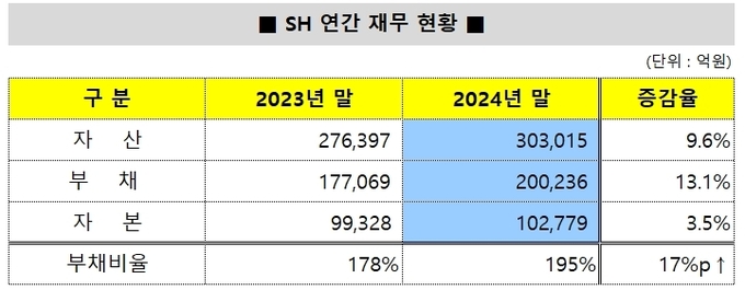 반면 재무 건전성 지표는 개선되지 못했다. SH의 부채비율은 178%에서 195%로 17%p 증가해 200%에 가까운 수준까지 올라섰다. 부채 확대의 배경으로는 임대주택 유지·정비비용의 구조적 증가, 정책형 사업 확대에 따른 선투입 구조, 정비·분양사업 일정 지연으로 인한 현금 회수 정체 등이 지목된다.