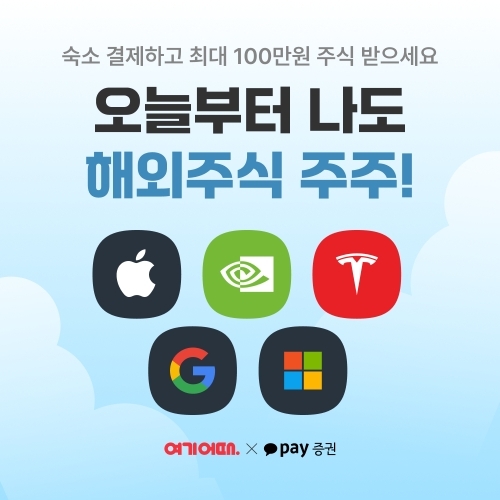 [FETV=장명희 기자] 대한민국 여행ㆍ여가 플랫폼 여기어때(대표 정명훈)가 카카오페이증권과 함께 해외 주식 제공하는 ‘오늘부터 나도 해외주식 주주’ 이벤트를 진행한다고 밝혔다.