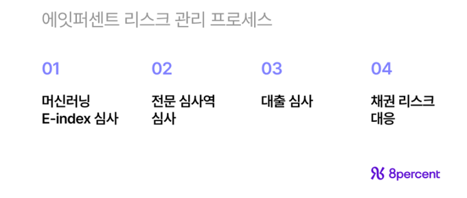 올해 11월 말 기준 에잇퍼센트의 연체율은 1.18%로 개인신용·부동산·증권계좌 등 다변화된 포트폴리오를 운영하는 온투사 가운데 가장 낮은 수준이다. 낮은 연체율의 배경으로는 정교한 리스크 관리 체계가 꼽힌다. 에잇퍼센트는 자체 개발한 AI 기반 신용평가 모형(E-index 4.0)을 중심으로 개인회생 예측 등 보조 모형을 결합해 대출 전 과정에 적용하고 있다. 규제·시장 변화에 맞춰 모형을 수시로 업데이트하는 자동화 체계도 강점이다.