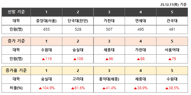 수도권 주요 대학에서도 중앙대(서울) 655명, 가천대 507명 등으로 큰 규모의 인원을 모집하며, 상위권 대학에서도 인원 증가 폭이 크게 오른 것으로 나타났다. 주목할 점은 주요 상위권 대학에서 정시 대비 편입 선발 비율이 30%를 넘어선 대학들이 다수 등장했다는 점이다. 이러한 흐름은 신입생 중도탈락 급증과 의대 정원 확대, 약대 이탈 등으로 인한 재학생 이탈이 증가한 것이 직접적인 배경이 된 것으로 분석된다.
