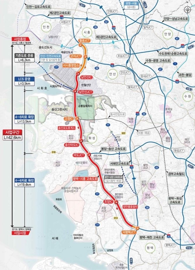 현재 왕복 4차로로 운영 중인 평택–시흥 고속도로는 이번 사업을 통해 6~8차로로 확장된다. 서평택JCT(분기점)에서 마도JCT까지는 6차로로, 마도JCT에서 남안산JCT까지는 8차로로 각각 확장되며 총공사 기간은 60개월이 소요될 예정이다.