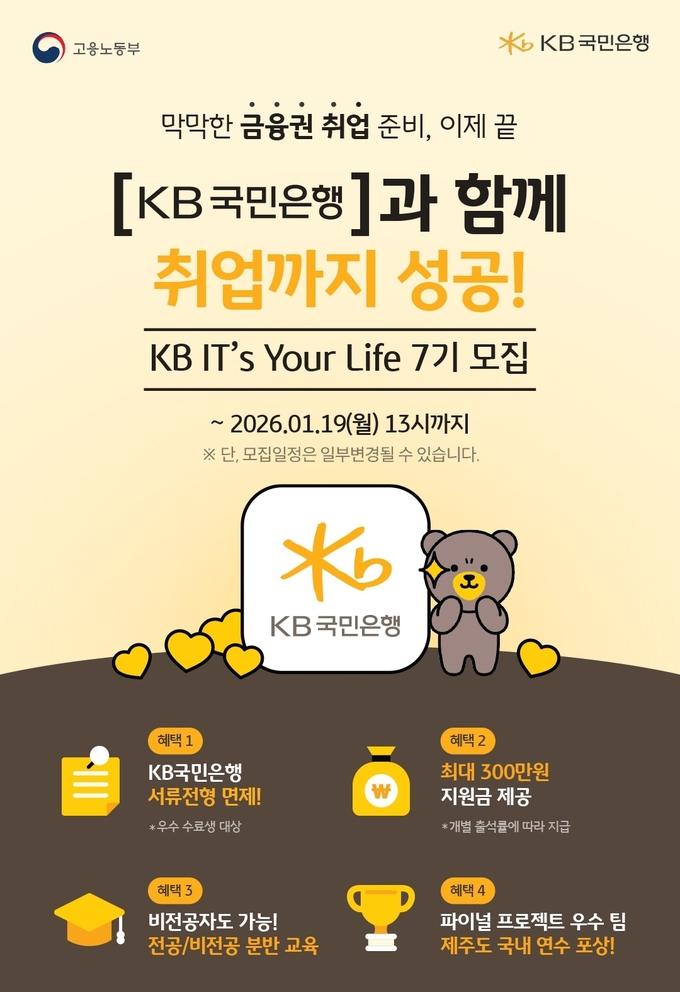 KB국민은행 관계자는 “KB국민은행은 AI를 포함한 디지털 역량을 갖춘 인재 양성에 지속적으로 힘써오고 있다”며, “이번 KB IT’s Your Life 7기에도 열정 있는 청년들의 많은 관심을 부탁드린다”고 말했다.