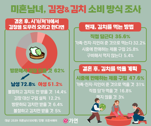 결혼정보회사 가연은 올 초 진행한 ‘2025 결혼 인식 조사’를 통해 ‘김장과 김치 소비 방식’에 대한 미혼남녀의 인식을 살펴봤다. (2539남녀 500명 대상, 오픈서베이 진행, 신뢰수준 95%, 표본오차 ±4.38%P)