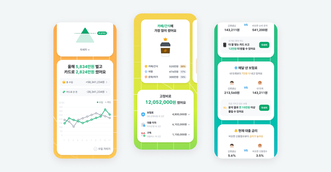 또 한 해 동안 받은 카드 혜택을 1원 단위까지 계산해 알려주고 나와 비슷한 금액을 지출하는 사용자들과 받은 혜택을 비교해준다. 보험 역시 월 납입 보험료와 또래 평균 납입 보험료를 비교해 보험료 절감 방법을 안내한다. 대출을 보유한 경우 비슷한 신용 점수를 보유한 사용자와 비교해 내 대출 금리 수준을 진단한다.