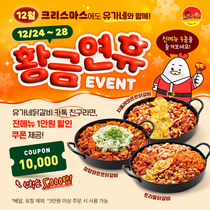유가네 관계자는 “올 한 해 유가네를 사랑해 주신 고객들에게 감사의 마음을 전하고자, 25년의 마지막 연휴를 풍성하게 즐길 수 있도록 마련했다”라며, “카카오톡 채널을 통해 간편하게 쿠폰을 받아, 가족, 연인, 친구와 함께 유가네에서 따뜻하고 즐거운 크리스마스를 보내시길 바란다”라고 전했다.