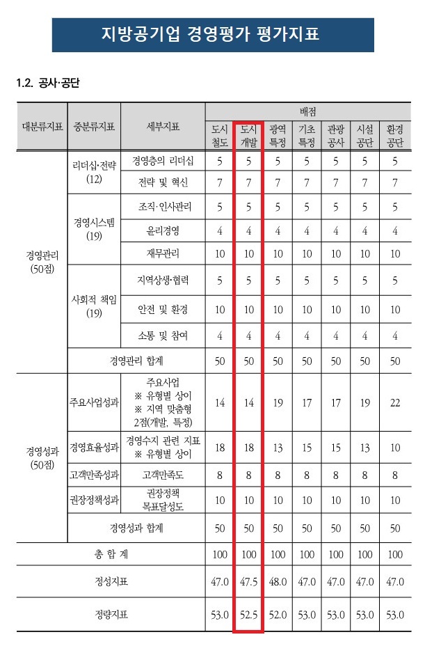 도시개발공사 등 지방공기업은 행정안전부 주관으로 기업경영평가를 받는다. 평가는 ‘가’부터 ‘마’까지 5개 등급으로 나뉘며 경영목표 달성도, 업무 효율성, 공익성, 고객서비스 등을 기준으로 경영관리와 경영성과 부문을 종합 평가한다.